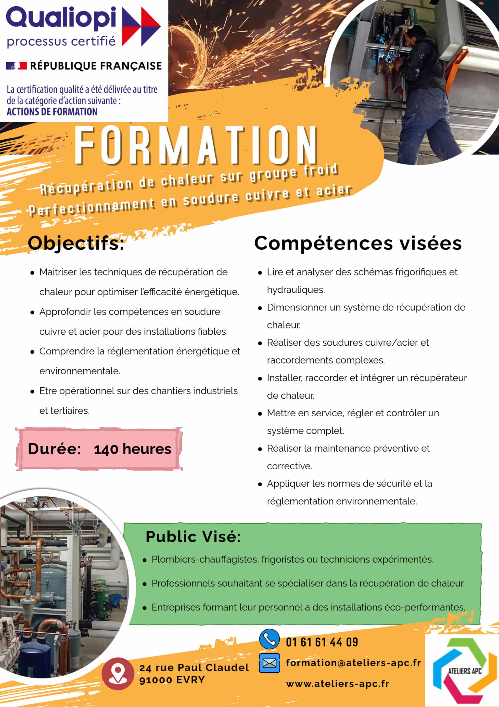 - Mise en situation pratique : réalisation complète d’un montage récupérateur avec brasage cuivre/acier et mise en service sous contrôle formateur.